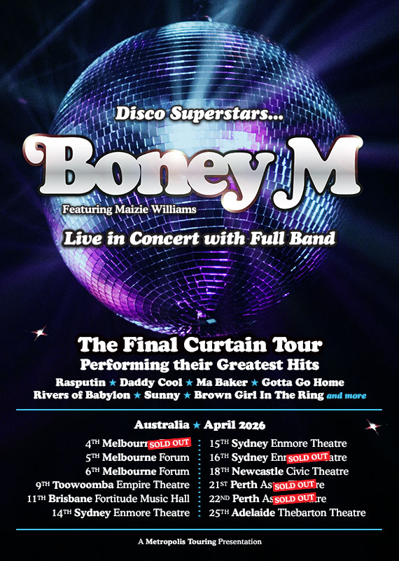 Disco Megastars BONEY M Featuring Maizie Williams return for The Final Curtain Tour to Performing all their Greatest Hits including Rasputin, Daddy Cool, Sunny, Rivers Of Babylon, Ma Baker, Gotta Go Home, Brown Girl In The Ring plus more with a full live band.