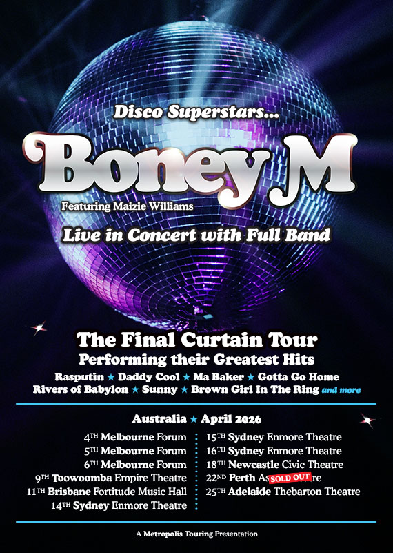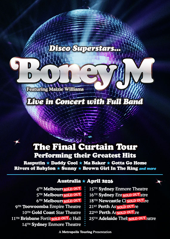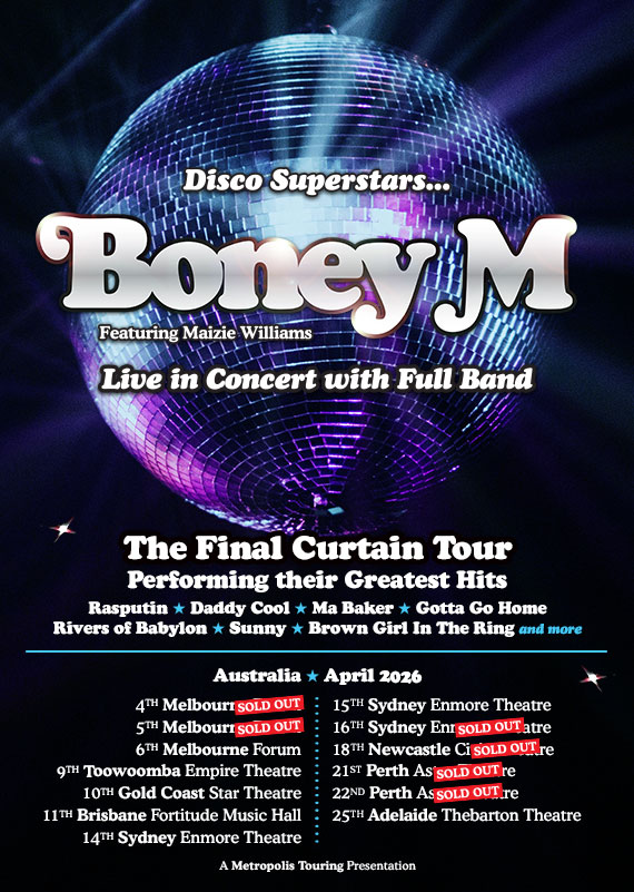 Disco Megastars BONEY M Featuring Maizie Williams return for The Final Curtain Tour to Performing all their Greatest Hits including Rasputin, Daddy Cool, Sunny, Rivers Of Babylon, Ma Baker, Gotta Go Home, Brown Girl In The Ring plus more with a full live band.