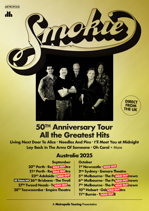 SMOKIE’s All the Greatest Hits Tour will feature every single hit record they had including Lay Back in the Arms of Someone, Needles and Pins, I’ll Meet You at Midnight, Oh Carol and of course Living Next Door to Alice which has sold over 10 million copies worldwide. SMOKIE’s “All the Best” compilation sold an incredible 230,000 copies in Australia!